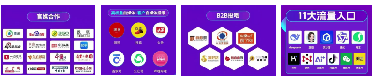 你看,这些是跟我们合作的一些官媒,帮助你建立权威背书,以及这些B2B平台的投喂,帮你夯实产品信息。另外,在这些高权重自媒体和客户自媒体中,进行海量内容的覆盖。